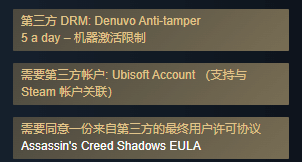 日前,《刺客信条:影》更新的Steam详情页中确认本作将采用Denuvo防篡改技术,并提出了需关联育碧账号的要求。