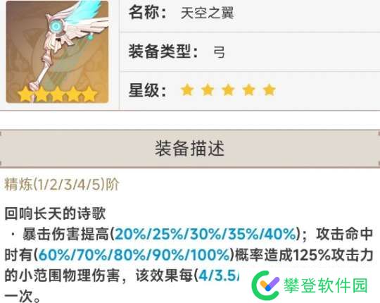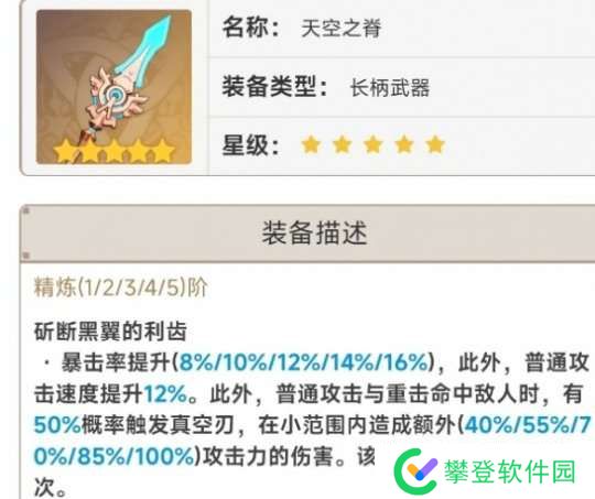 天空之翼的副词条可以增加22.1%的暴击率,减轻角色装备圣遗物的压力,适合所有以攻击力为主要影响因素的主DPS角色。