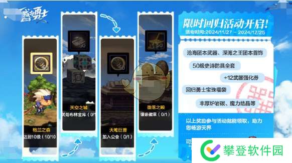回归的勇士累计登录游戏、与邀请人一起攻坚降临:罗特斯,可领取幸运符、闪亮的一次性强化器、西部深渊派对邀请函、金币等奖励