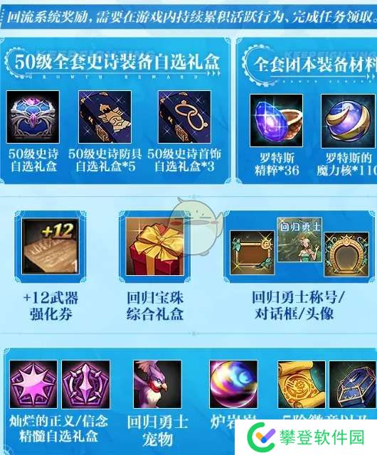 在游戏内成长冲级,可领取全套50级史诗装备(带强化属性)、团本武器和首饰等奖励