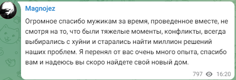 战队官宣下放nafany与KaiR0N-后,队友Magnojez在个人社交媒体账号上发文告别了两位老队友,并对二人表达了感激之情。
