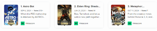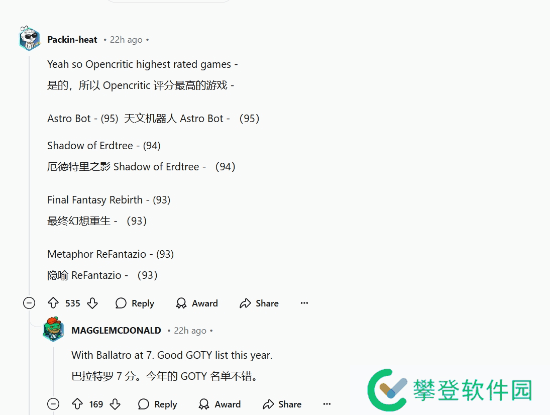 有网友列出了OC站的评分榜单,《宇宙机器人》以95分领跑,紧随其后的是《艾尔登法环:黄金树幽影》以94分位居第二。《最终幻想7:重生》和《暗喻幻想:ReFantazio》则并列第三,均获得93分的好评。