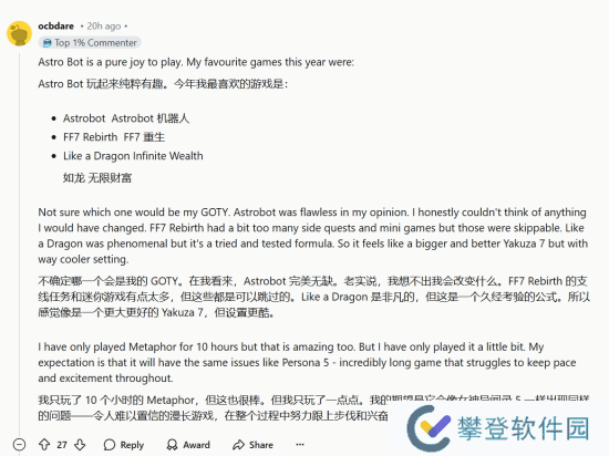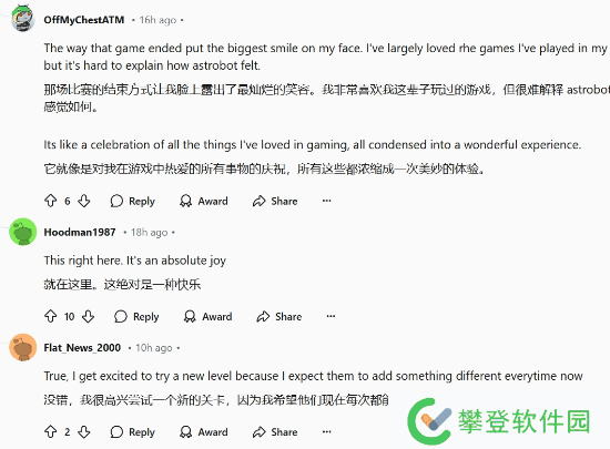 位网友评论中提到:“《宇宙机器人》真的是纯粹的快乐。我今年最喜欢的几款游戏是:《宇宙机器人》,《最终幻想7:重生》,《如龙8:无限财富》。我不确定哪个会成为我的年度游戏。《宇宙机器人》在我看来是完美无缺的,我实在想不出有什么地方可以改进。虽然《最终幻想7:重生》有太多支线任务和迷你游戏,但这些内容可以跳过。至于《如龙:无限财富》,虽然依然沿用了试过的公式,但它在设定上更加酷炫,感觉像是一个更大、更好的《如龙7》。”