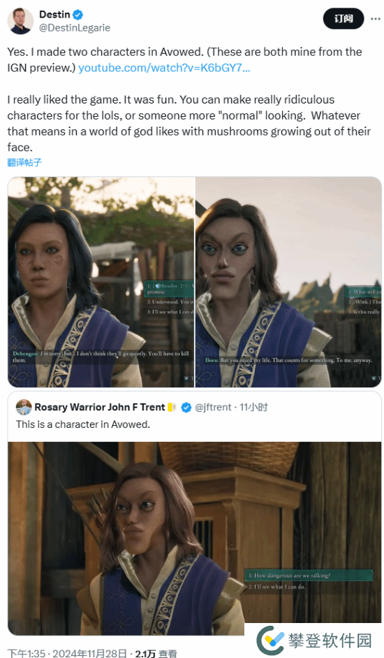 11月28日,IGN编辑@DestinLegarie发推,证实这名女角色的脸是自己捏的。“我真的很喜欢这个游戏,玩起来很有趣。你可以为了搞笑创造一些非常荒诞的角色,或者做出一些有着更‘正常’外观的角色。当然,在《宣誓》的游戏世界里,‘正常’到底意味着什么就很难说了。”