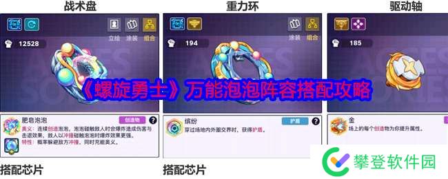螺旋勇士万能泡泡阵容怎么搭配?游戏中万能泡泡阵容是以肥皂泡泡为核心,搭配绿色充能与回复芯片。肥皂泡泡释放奥义时,会触发驱动轴金的属性加成,陀螺攻防及持久等属性瞬间提升 180%。下面给大家带来了《螺旋勇士》万能泡泡阵容搭配攻略!