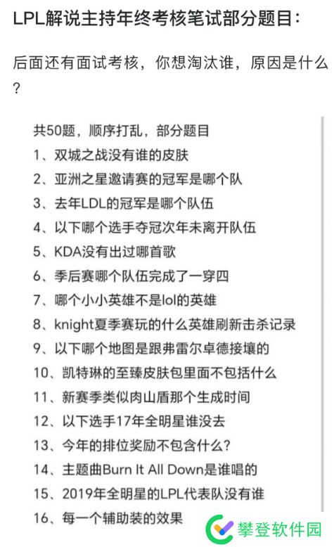 直播吧12月3日讯 近日网上曝出LPL解说主持年终考核题目(未知解说主持是否在考试前有题库准备),题目难度有些略高,对此网友也是纷纷表示:这是操着开除的劲头出的题吗??