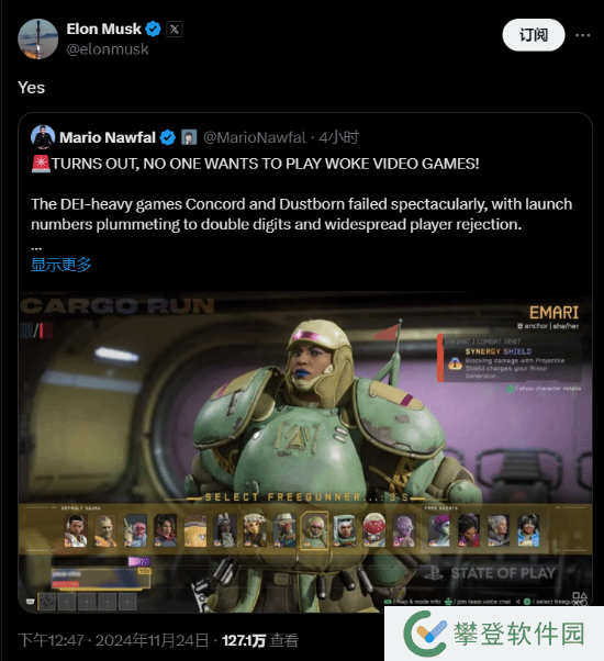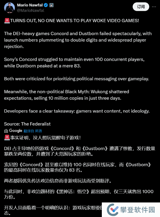 推文中写道,《星鸣特攻》和《尘路之旅》这两款在DEI领域占主导地位的游戏都遭遇销量“滑铁卢”,遭到了大范围玩家的拒绝:“《星鸣特攻》甚至难以位置超过三位数的玩家在线,而《尘路之旅》的历史同时在线峰值也仅为83人。两者都因注重传达**信息而非游戏玩法而受到批评。”