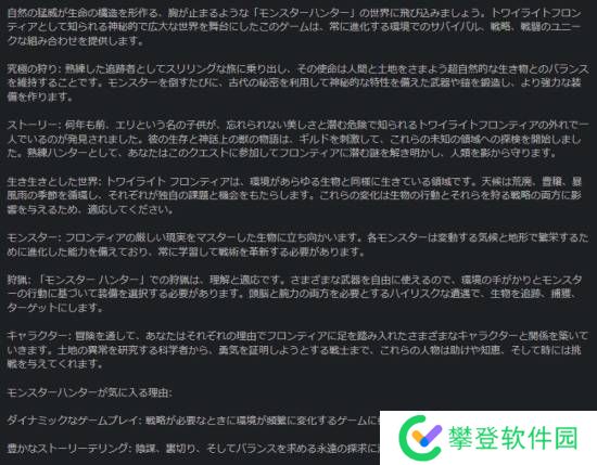 还不止于此,在简介中,游戏如此介绍:在神秘且广阔的世界“黄昏边境”(Twilight Frontier)。玩家将在一个四季循环变化的动态环境中生存,并狩猎怪物。该游戏仅支持离线单人模式。