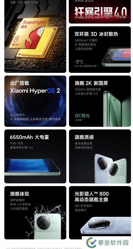 新机搭载 6550mAh 小米金沙江电池,支持 90W 闪充,搭载 K80 Pro 同款“大满贯”2K 护眼屏、超声波指纹。参数方面,该机搭载第三代骁龙 8 移动平台,具备 Pro 同款双环路 3D 冰封散热及狂暴引擎 4.0、光影猎人 800 主摄,支持 OIS 光学防抖。