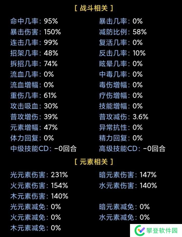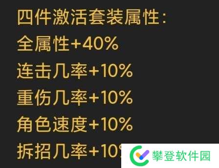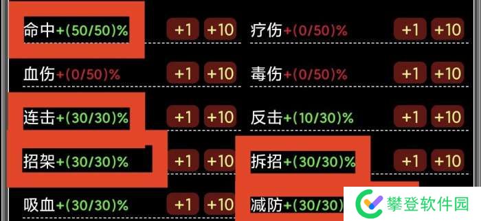 武器连击=减防=招架几率=重伤=普攻增伤=命中 减防&增伤 : 提升伤害 命中&连击 : 提升命中率和武器连击率 (堆高) 招架&重伤 : 提升特殊属性触发率