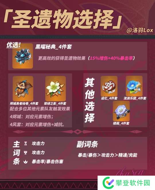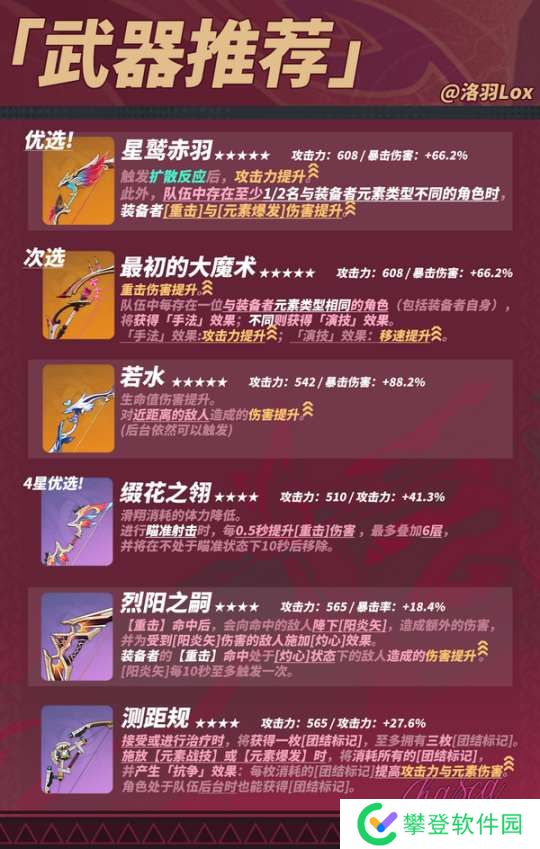 除了上图的武器外,还可以考虑5星武器【阿莫斯之弓】、【飞雷之弦振】,4星武器【静谧之曲】、【破魔之弓】、【绝弦】,以及3星武器【弹弓】作为次选或前期过渡方案。