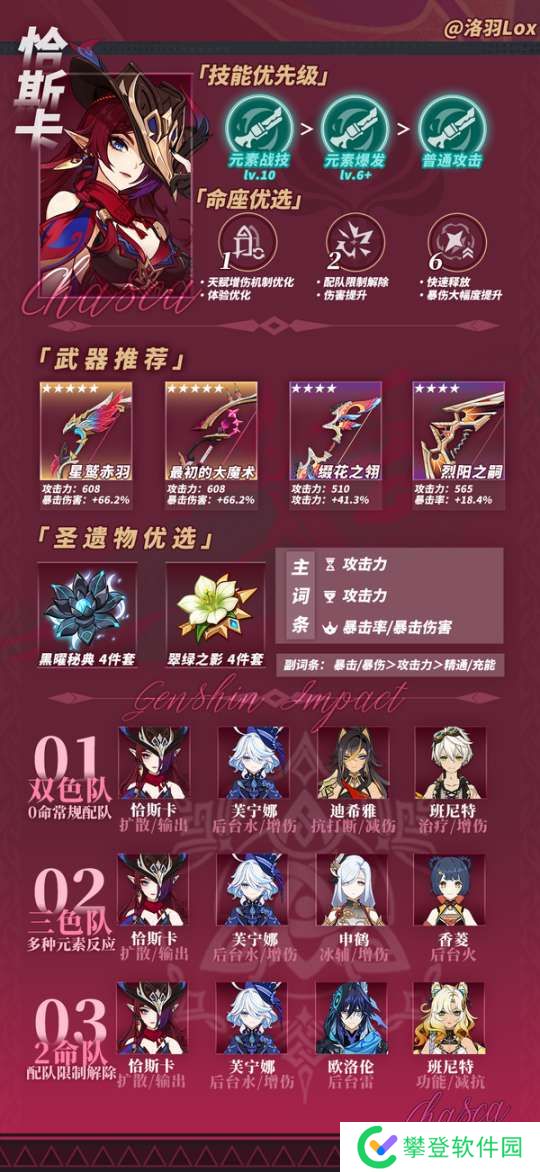 恰斯卡是一名根据队伍中多种不同元素打出染色伤害的风元素站场主C。在战斗时无论是对单还是对群,都有这不错的伤害表现。大世界跑图时,不管是否在纳塔境内,都可以凭借其优秀的“御枪飞行”进行长距离飞行。