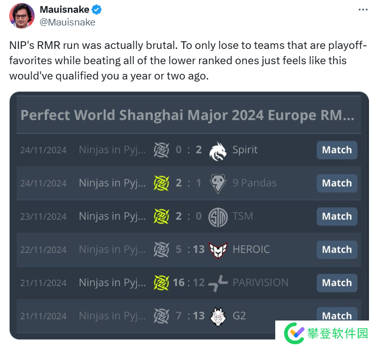 Mauisnake:“NIP的RMR之旅其实非常艰难。他们仅仅输给那些被看作淘汰赛的热门战队,而战胜了所有排名较低的队伍。要是放在一两年前,这种表现感觉足以晋级。”
