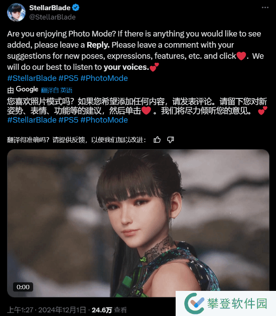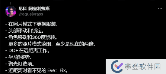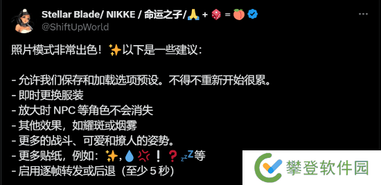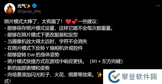 《剑星》拍照功能已于11月20日更新,游民老哥们有没有拍伊芙的美照呢?官方今日发文,询问玩家们对拍照功能的满意度,并欢迎提出新姿势、表情或者功能类的建议,官方会尽力倾听。