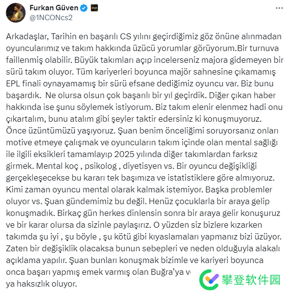 Eternal Fire首席执行官Furkan Güven在个人社交媒体账号上发表了一份长篇声明,回应了最近关于“战队正在考虑用jottAAA替换掉Calyx”的谣言。