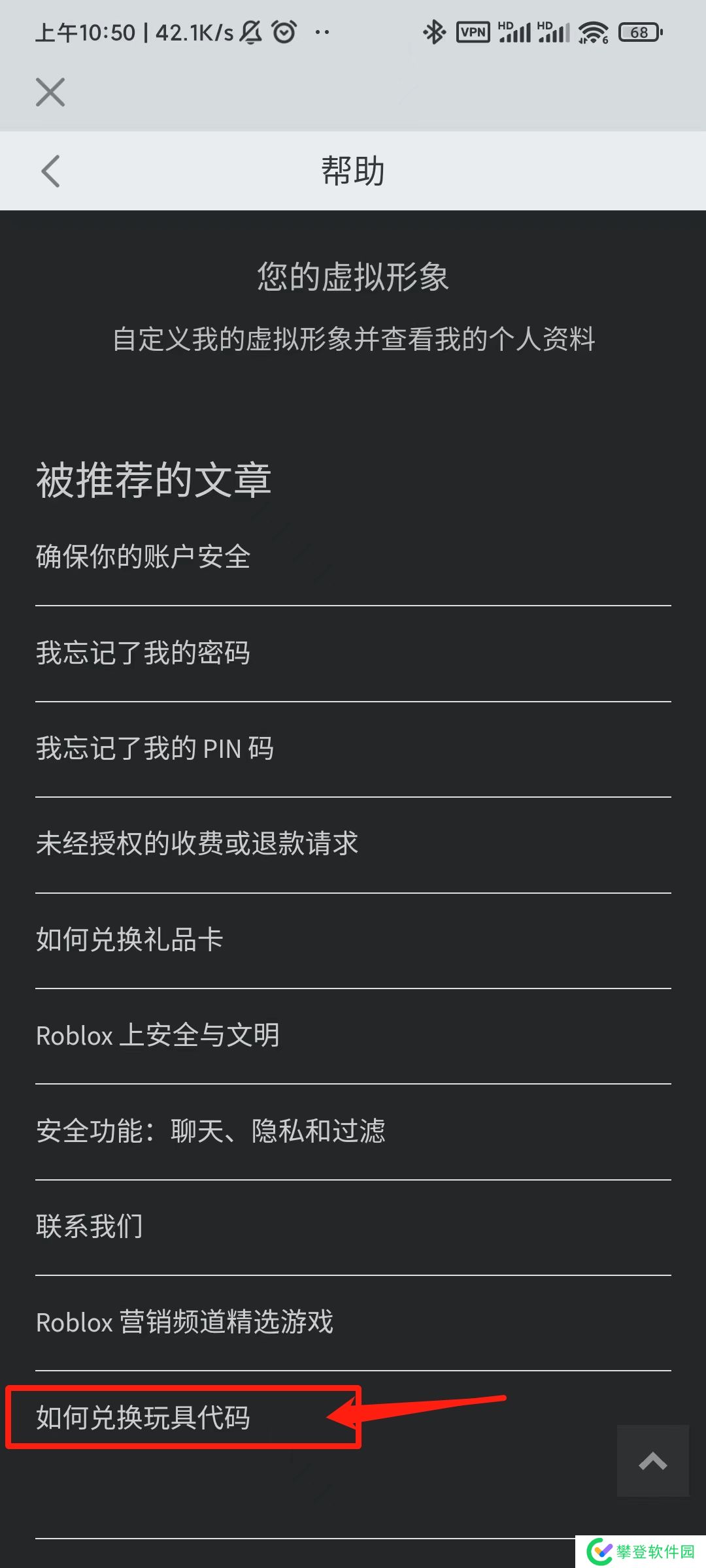 3、进入“帮助”页面后,选择最后一栏的【如何兑换玩具代码】问题。