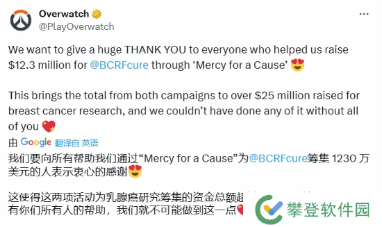 《守望先锋》官方账号今日发文,宣布通过“Mercy for a Cause”活动,成功筹集了1230万美元用于乳腺癌研究基金会(BCRF)。这一筹款成果使得游戏自启动慈善活动以来,累计为乳腺癌研究募得超过2500万美元的善款。