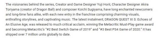 在今日公布《勇者斗恶龙3 HD-2D重制版》销量的新闻稿中,Square Enix在文章末尾也透露了《勇者斗恶龙11》的销量。目前DQ11系列(含11S)的全球总销量已突破700万份!