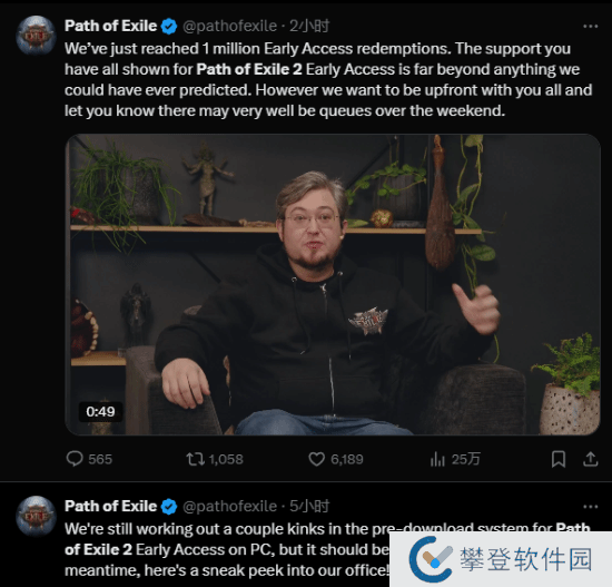 动作角色扮演游戏《流放之路2》抢先体验版即将于12月7日上线,开发商Grinding Gear Games游戏总监乔纳森·罗杰斯宣布,抢先体验版资格兑换次数已达到100万次,这意味着游戏上线后将有大量玩家涌入游戏。