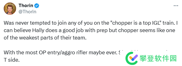 “我从未赞同过你们所说的‘chopper是顶级指挥’的说法,我相信hally的准备工作做得很好,但chopper似乎是他们队伍中最薄弱的一环。