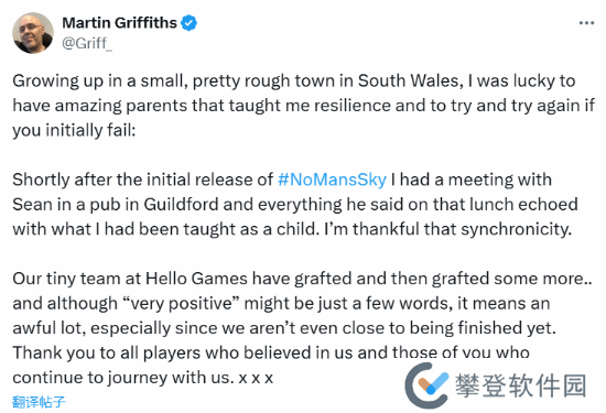 随后,《无人深空》引擎程序员Martin Griffiths也发推表达了一些感想,并表示《无人深空》距离做完还有着一段时间。“我在南威尔士的一个小镇长大,那里环境相当艰苦。但我很幸运有一对了不起的父母,他们教会了我坚韧不拔,教会了我如果初次失败就要不断努力、再试一次。”