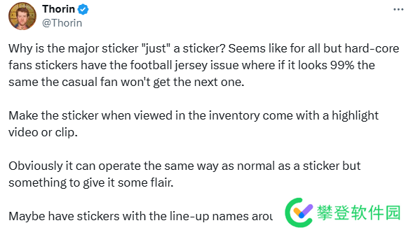 “为什么Major赛事的贴纸只能是一张贴纸呢?除了那些铁杆粉丝以外,选手贴纸就像是足球队的队服一样,如果它跟之前的贴纸对比看起来99%都一样,那普通粉丝可能就没兴趣继续消费了。