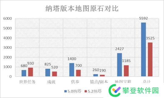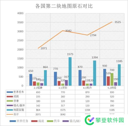 1. 横向对比:各国家(除蒙德、璃月)第二块地图的原石对比图如下,纳塔版本的原石数目依旧比较丰厚