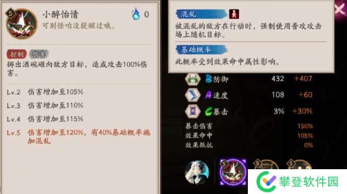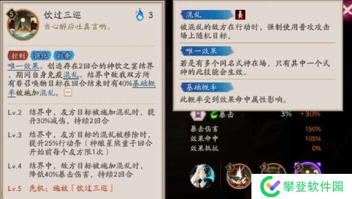 Lv.4 结界中,敌方目标被施加混乱时,降低40%暴击伤害,持续2回合Lv.5先机:施放「饮过三巡」