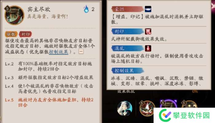 唯一效果。创造存在2回合的神饮之宴结界,期间自身免疫混乱。结界中敌我双方所有非召唤物目标在回合结束时有40%基础概率被施加混乱。
