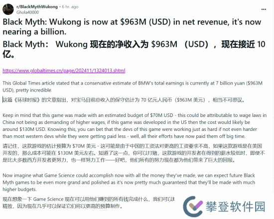 Reddit用户Ghola40000最近转发了《环球时报》的一篇报道,报道中提到《黑神话:悟空》目前的净收入已经达到了9.63亿美元,距离十亿美元大关只差一步。