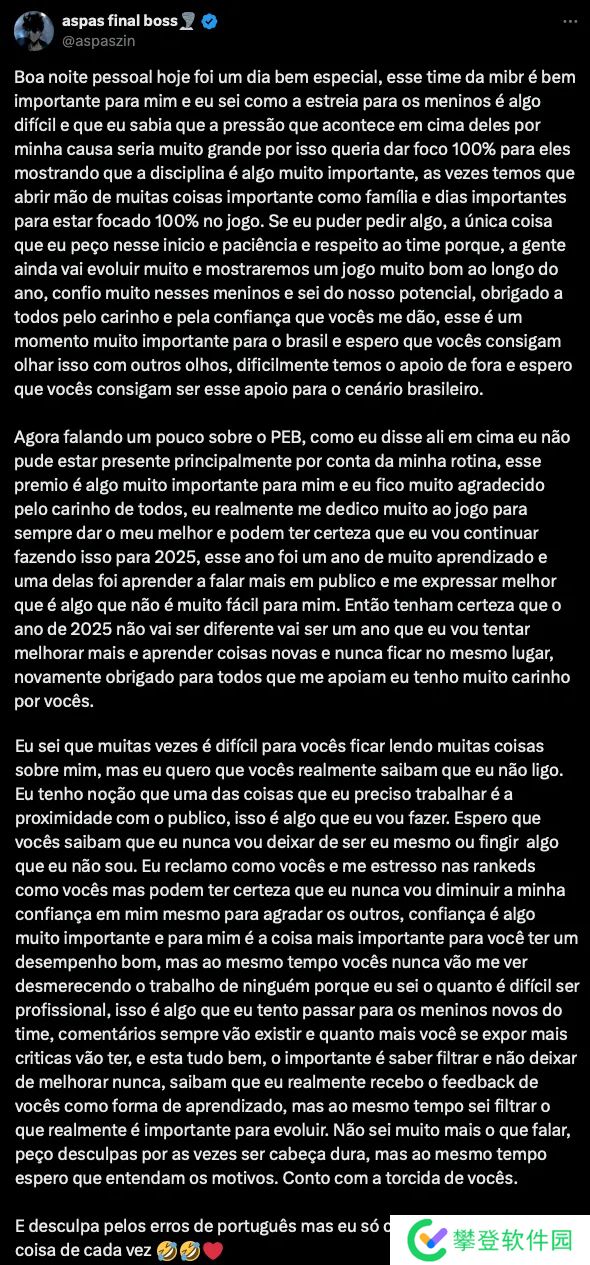 我知道,很多时候你们读到关于我的各种消息会感到不舒服,但我希望你们真的能明白,我并不在意。我清楚自己需要改进的一点是与大家的互动,这是我将努力去做的。我希望你们知道,我永远不会改变自己或假装成什么样的人。我会像你们一样在排位赛中抱怨、发脾气,但请相信,我绝不会为了取悦别人而降低对自己的信心。自信对我来说非常重要,也是取得好成绩的关键。但与此同时,你们也永远不会看到我贬低任何人的努力,因为我知道成为一名职业选手有多么不容易。这也是我一直试图传达给队里新人的理念。评论总是会存在的,而且曝光度越高,批评就越多,这没关系,重要的是懂得筛选,并且永不停止进步。请相信,我确实会把你们的反馈当作学习的方式,但与此同时,我也知道如何过滤出真正对我成长有帮助的内容。我也不知道还能说什么了,如果有时我显得固执,请原谅我,但同时也希望你们能理解原因。我需要你们的支持。