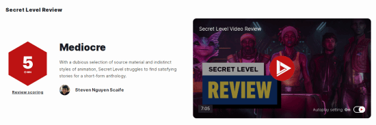 《爱、死亡和机器人》团队原创动画剧集《秘密关卡》将于12月10日正式开播,剧集讲述多个基于电子游戏的故事,IGN为剧集给出了5分的评价。