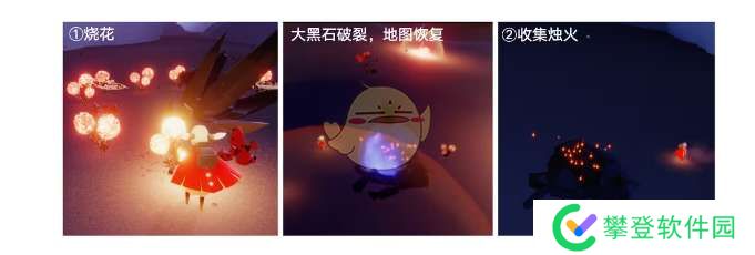 2、黑石比较简单,只有烧黑花,烧到一定程度后(不一定要烧完)最大的黑石会破裂,出现一堆烛火,靠近就能收集 。(如下图)