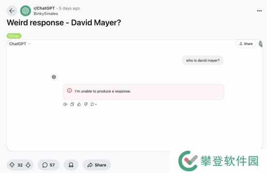 不管用户怎么修改提示词,但只要提及“David Mayer”这个名字,ChatGPT最终要么回复错误消息、要么阻止用户进一步询问。
