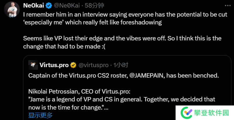 当我观看VP在这次Major上的比赛时,很明显,electroNic在个人发挥中严重失利。总的来说,VP的比赛非常薄弱。这里的问题是——谁该为此负责?是Jame需要被下放? 还是整个队伍都有责任?原因何在? 只有时间才能告诉我们。因为当我被NAVI下放时,你还记得他们的实力有所下降。他们带来了实力超强的选手s1mple,但却没有处理好。因为(很难)找到合适可以提出战术和各种话题的指挥。而Jame,我知道至少在之前,他在学习比赛、建设等方面做了很多工作。 这种风格很特别,很多人都不喜欢,但它取得了成果,这是事实。因此现在让我们来看看它的发展方向。