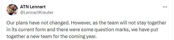 “我们的计划没有变化。然而,由于团队将不再以目前的形式继续,并且存在一些不确定因素,我们将会在明年组建一个新的团队。”