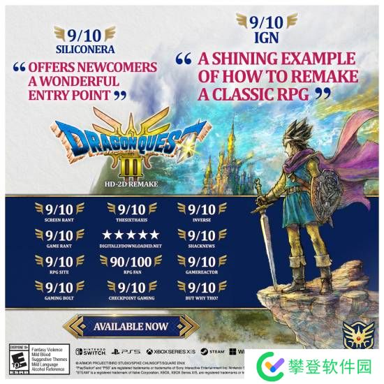SE公布《勇者斗恶龙3:HD-2D重制版》媒体赞誉图,本作获得较高的评价。IGN9分“重制经典RPG的杰出典范”;siliconera9分“新手的绝佳入门作”。