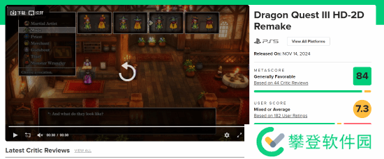 《勇者斗恶龙3:HD-2D重制版》在M站的媒体均分为84分,玩家均分7.3分,成绩也较为不错。精妙的回合制战斗系统、高度自由的职业系统、充满秘密的世界探索,至今仍让人着迷。