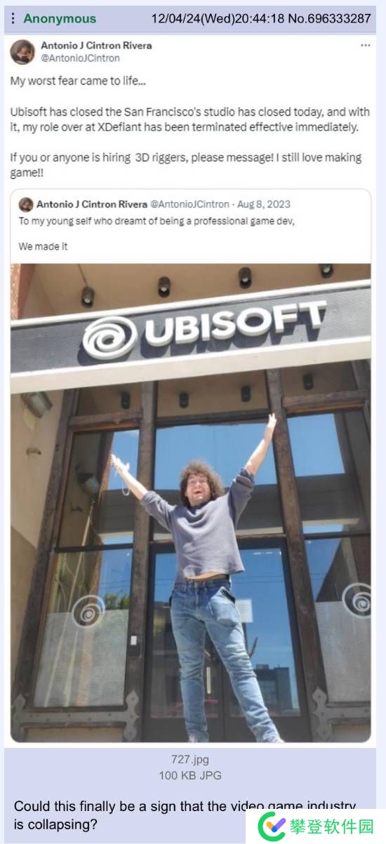 令人感叹的是,AntonioJCintron曾于2023年8月份发了一张在育碧门口兴高采烈的照片,并配文“年轻时我梦想成为专业的游戏开发者,现在我做到啦!”。仅一年多,这份收获梦想的喜悦就转变为被裁员的压力。