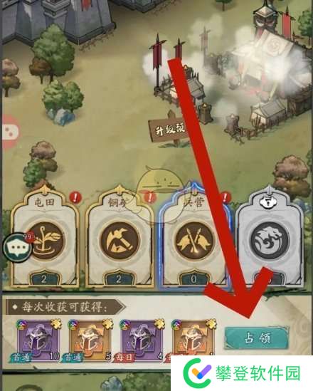 答:在历练页面点击厉兵秣马,选择兵营-占领兵营,占领成功即可领取资源奖励