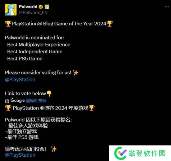 索尼PlayStation Blog官方发起2024年度最佳游戏投票,《幻兽帕鲁》获得最佳多人体验、最佳独立游戏、最佳PS5游戏三项提名,官方发文拉票希望能得到玩家的支持。