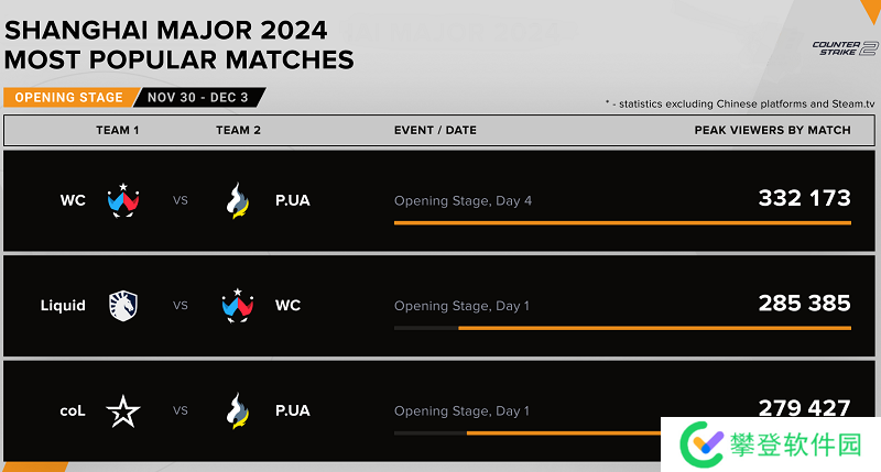 Passion UA,最高同时在线观众人数超过32.5万。总体而言,比起2024哥本哈根Major,中国观众数量较少,但淘汰赛阶段的情况可能会有所改变。