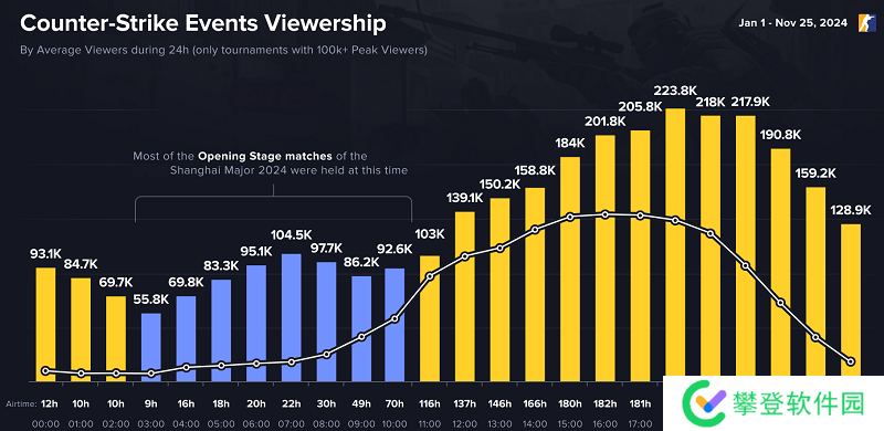 柱状图蓝**域为上海Major开幕赛阶段的比赛时间和24小时内平均观看人数(仅统计观众人数超10万的CS赛事)