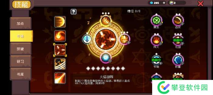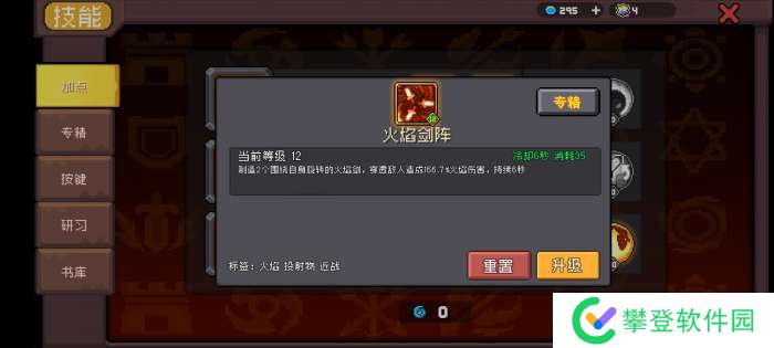 2、随着人物等级升级,会逐渐解锁所有技能,升级还会获得技能点,用技能点可以升级技能。拥有专精的技能升级后会提升专精槽位(就是图中菱形那个),不同的专精需要的槽位不同,具体看具体专精,在专精界面就能装配专精。