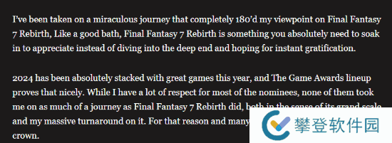 作者总结,虽然对大多数提名游戏都充满敬意,但没有哪一款游戏像《重生》一样,给其带来了如此深刻的旅程,基于这些理由,《重生》完全配得上年度最佳游戏的荣誉。