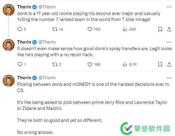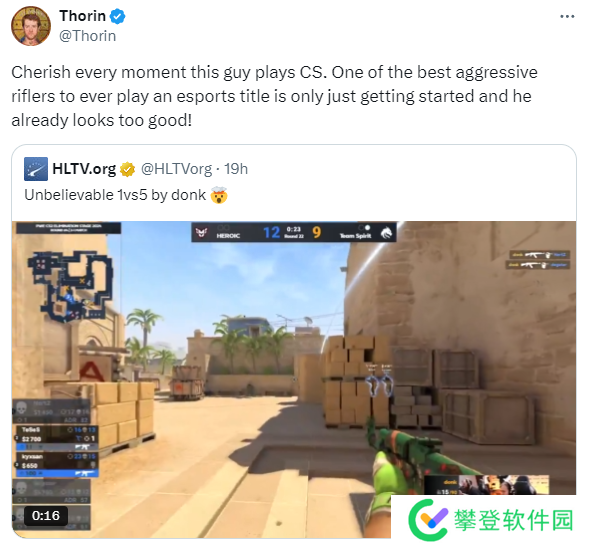 在昨日比赛中打出堪称年底最佳操作的1v5残局后,英国知名电竞记者兼分析师Thorin在个人媒体账号上发布动态,分享了他对donk的看法。