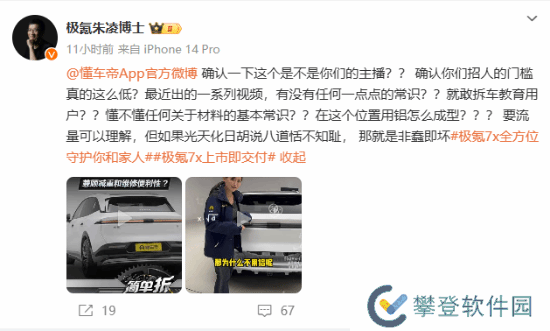 近日,极氪智能科技副总裁“朱凌博士”公开发布微博怒怼懂车帝一主播。