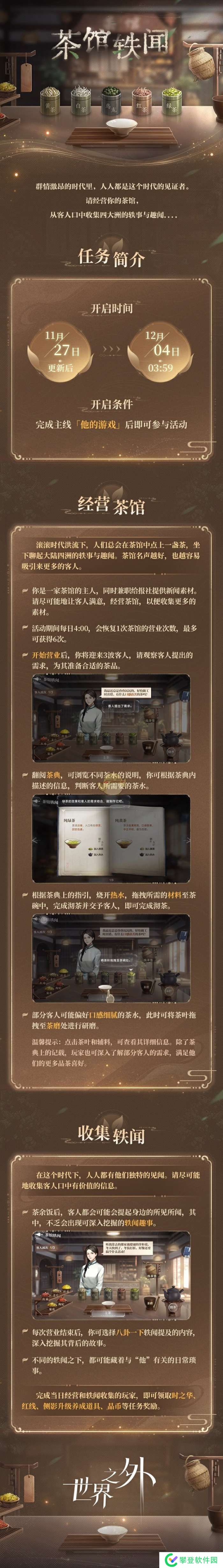 世界之外是一款非常热门的手游,在游戏中玩家可以见到非常多的活动,其中茶馆轶闻活动就是游戏中最新推出的一个活动,活动将于11月27日更新后上线,很多小伙伴不知道茶馆轶闻活动怎么玩,下面小编为大家带来了世界之外茶馆轶闻活动介绍,一起来和小编看看吧。