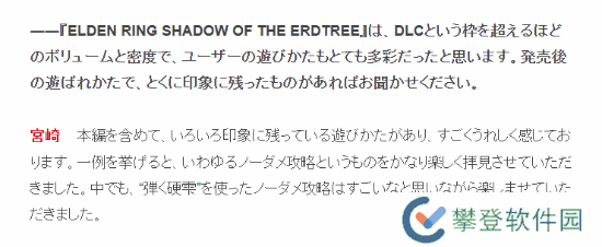 宫崎英高:最大的秘诀就是内容量。为了呈现“冒险感”,我们确保了有足够的内容量、未知的区域以及探索元素,这一点是至关重要的。另一方面,DLC也有许多需要反思和改进的地方,我会认真听取这些反馈,努力在下次做得更好。