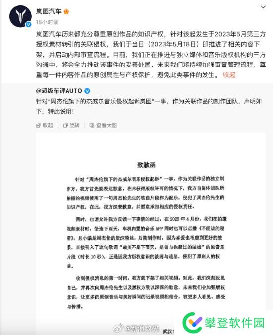 近日,@岚图汽车发文回应“周杰伦旗下的杰威尔音乐侵权起诉岚图”一事,称该起发生于2023年5月第三方授权素材转引的关联侵权,已于当日(2023年5月18日)即推进了相关内容下架,并启动内部审查流程。